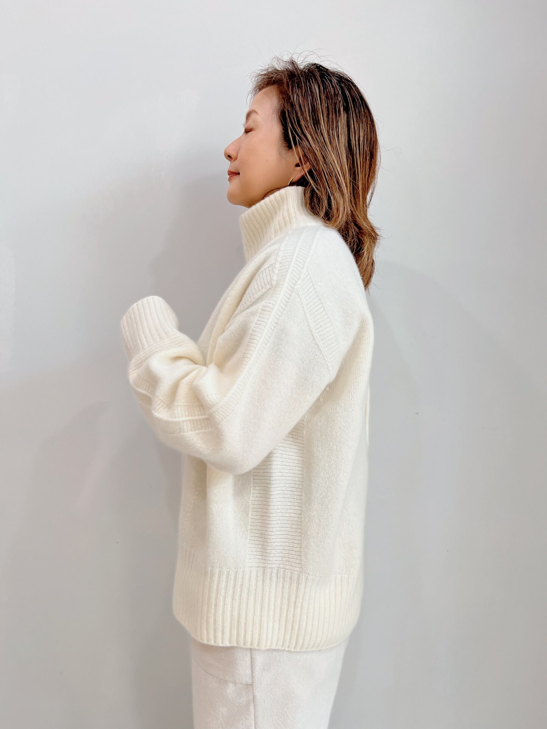 (ジロンラム)とホワイトカシミヤを混紡した糸を使用して、シームレスで立体的に編みたてています。